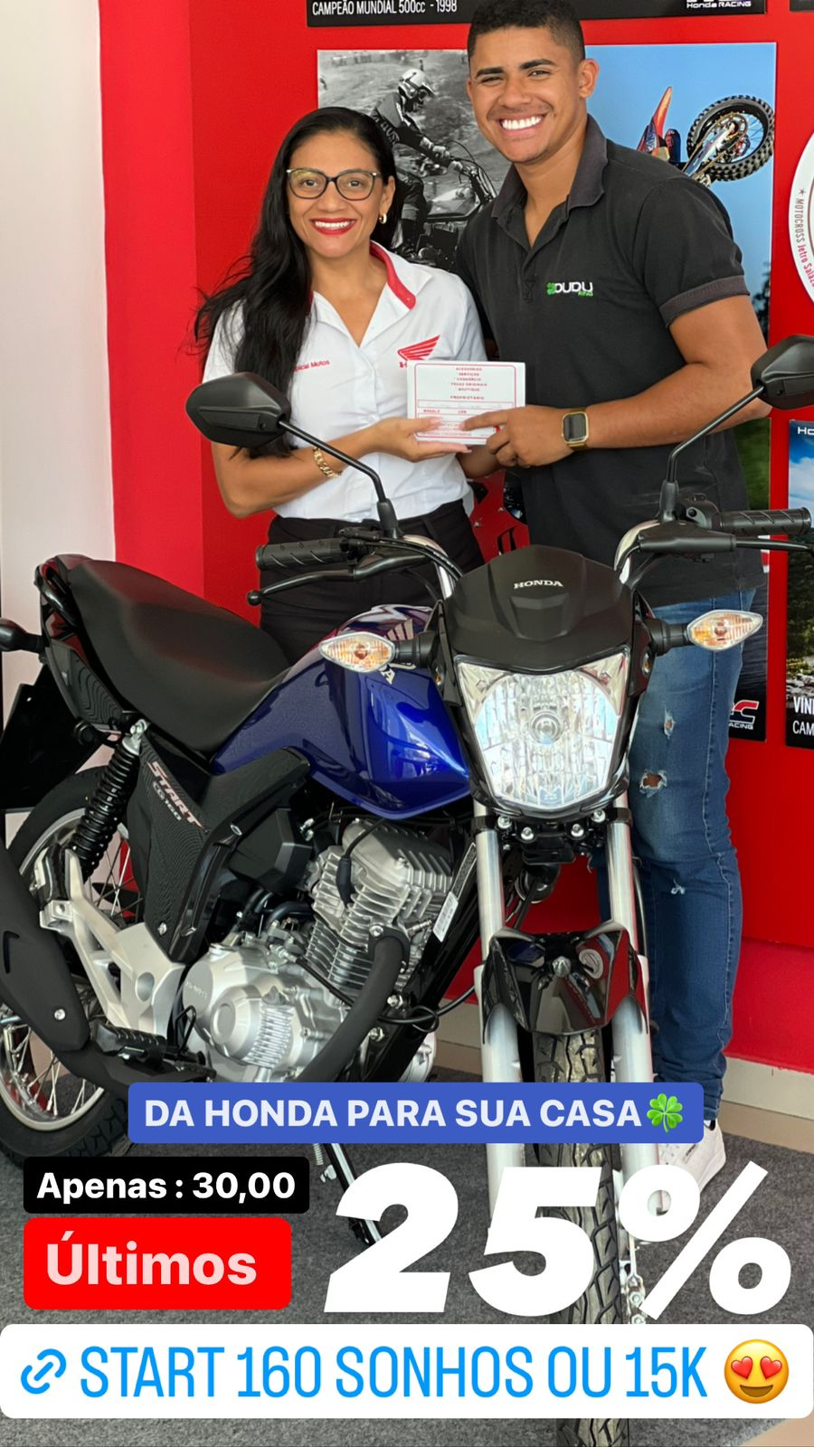Uma Start 160 ano 2023 ou R$ 15.000,00 no pix. Por apenas R$ 30,00. O maior comprador de cotas leva R$ 500,00 no pix. O emplacamento e transferência é por conta de Dudu Rifas!!