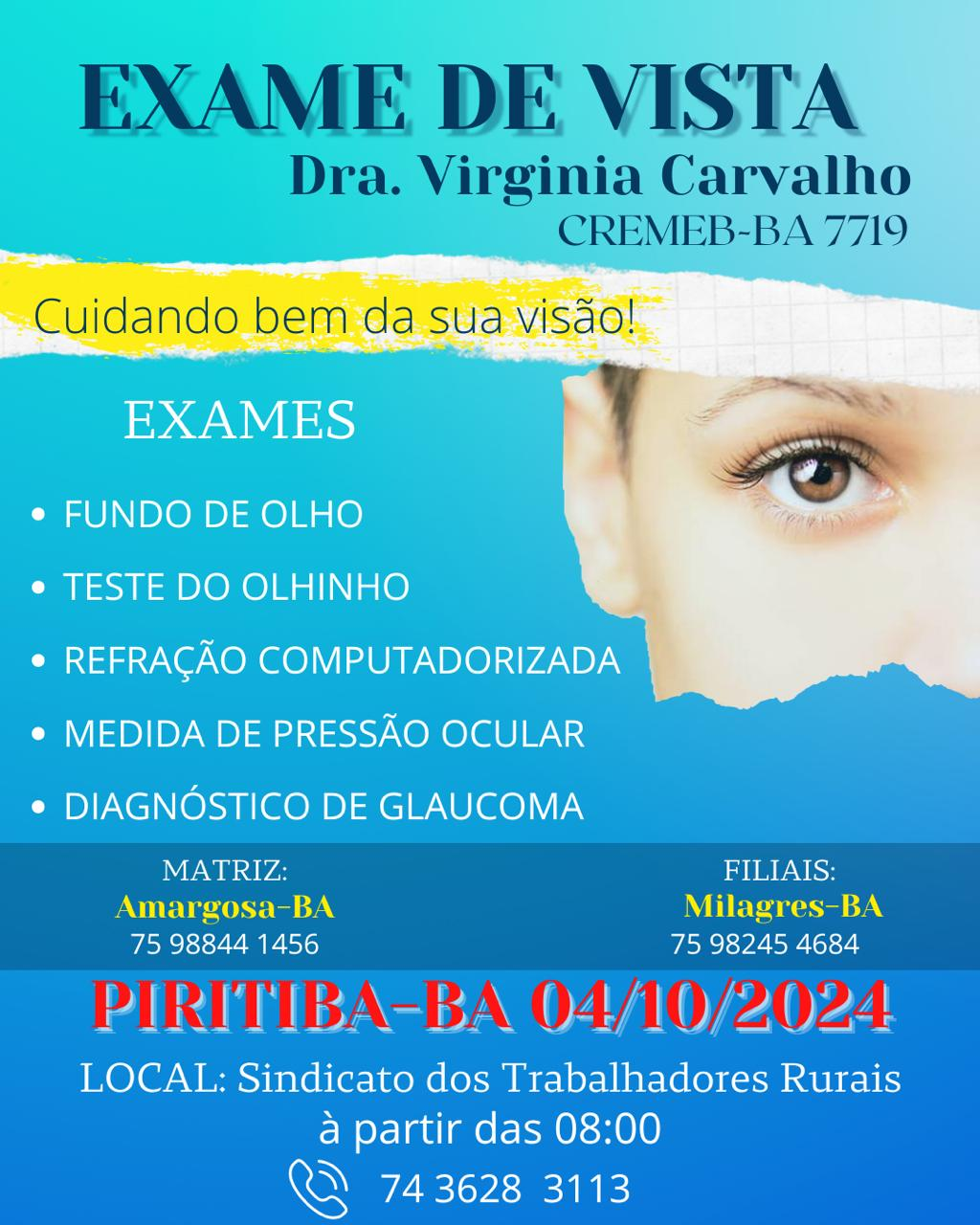 Acontecerá na sexta-feira, dia 04 de outubro de 2024, o exame de vista computadorizado no município de Piritiba-BA. A consulta será realizada na sede do Sindicato dos Trabalhadores Rurais, localizada na Avenida Fernandes, número 08, no Centro da cidade de Piritiba-BA.